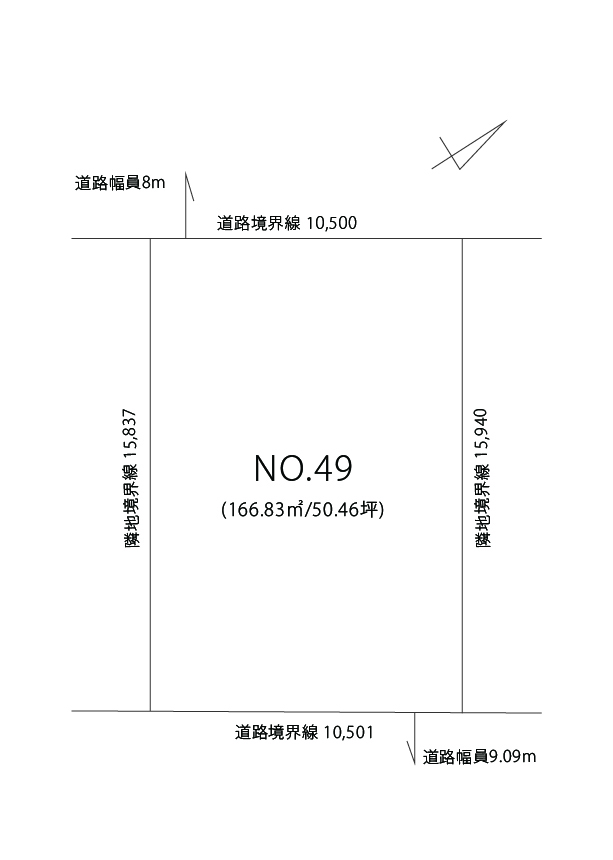 - 【二方】南東側道路 幅9.09m・接面10.501m/北西側道路 幅8.0m・接面10.500m