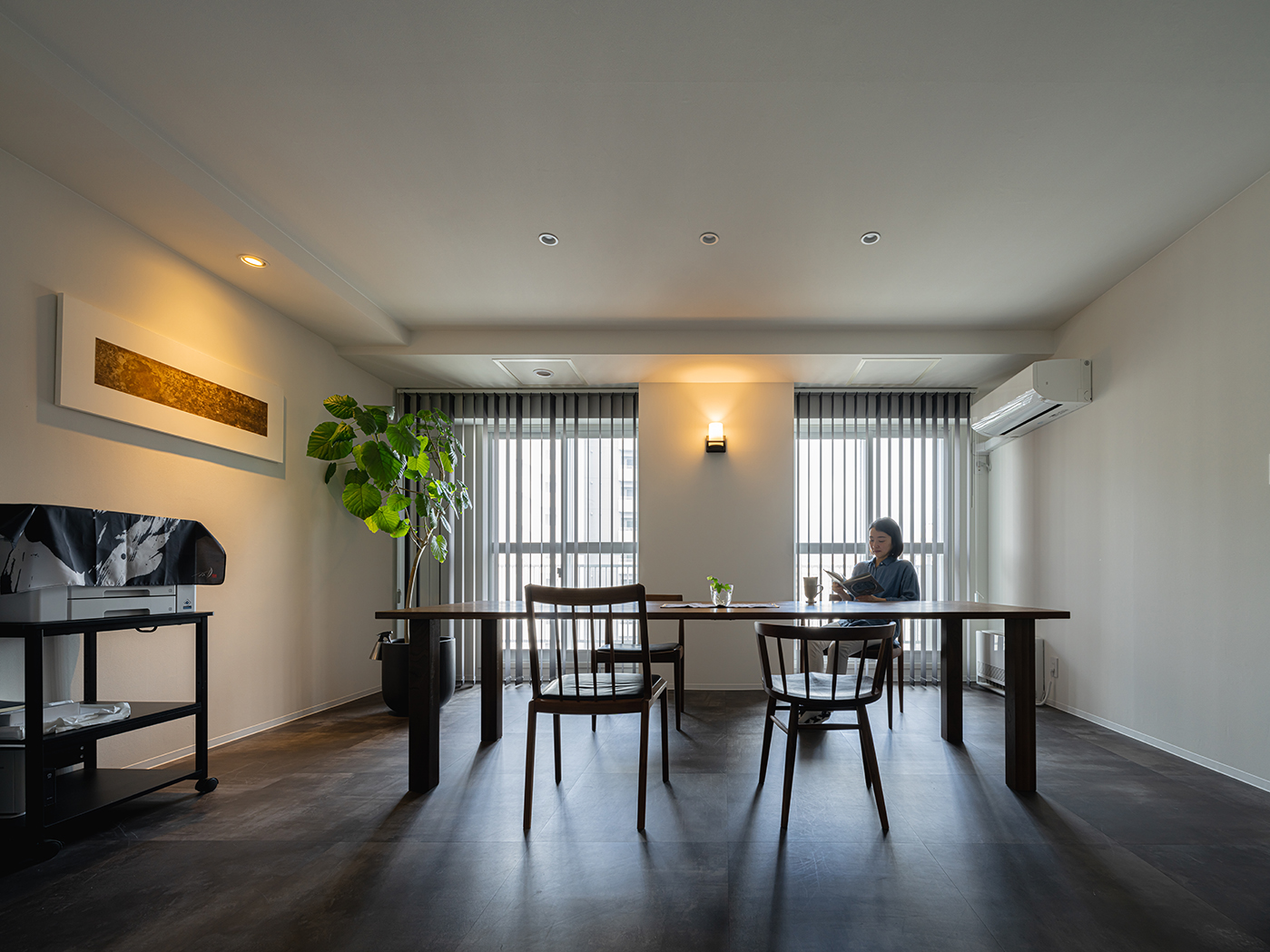 「中心街に住みたい。自分の好きな空間にしたい。それが叶うから、中古マンションをリノベーションすることに。」「玄関横のウォークインは、二人暮らしにはちょうど良い衣装部屋サイズ。」カウンターの上で畳んだり、アイロンをかけたり、物を置いたりできるのもポイントです。