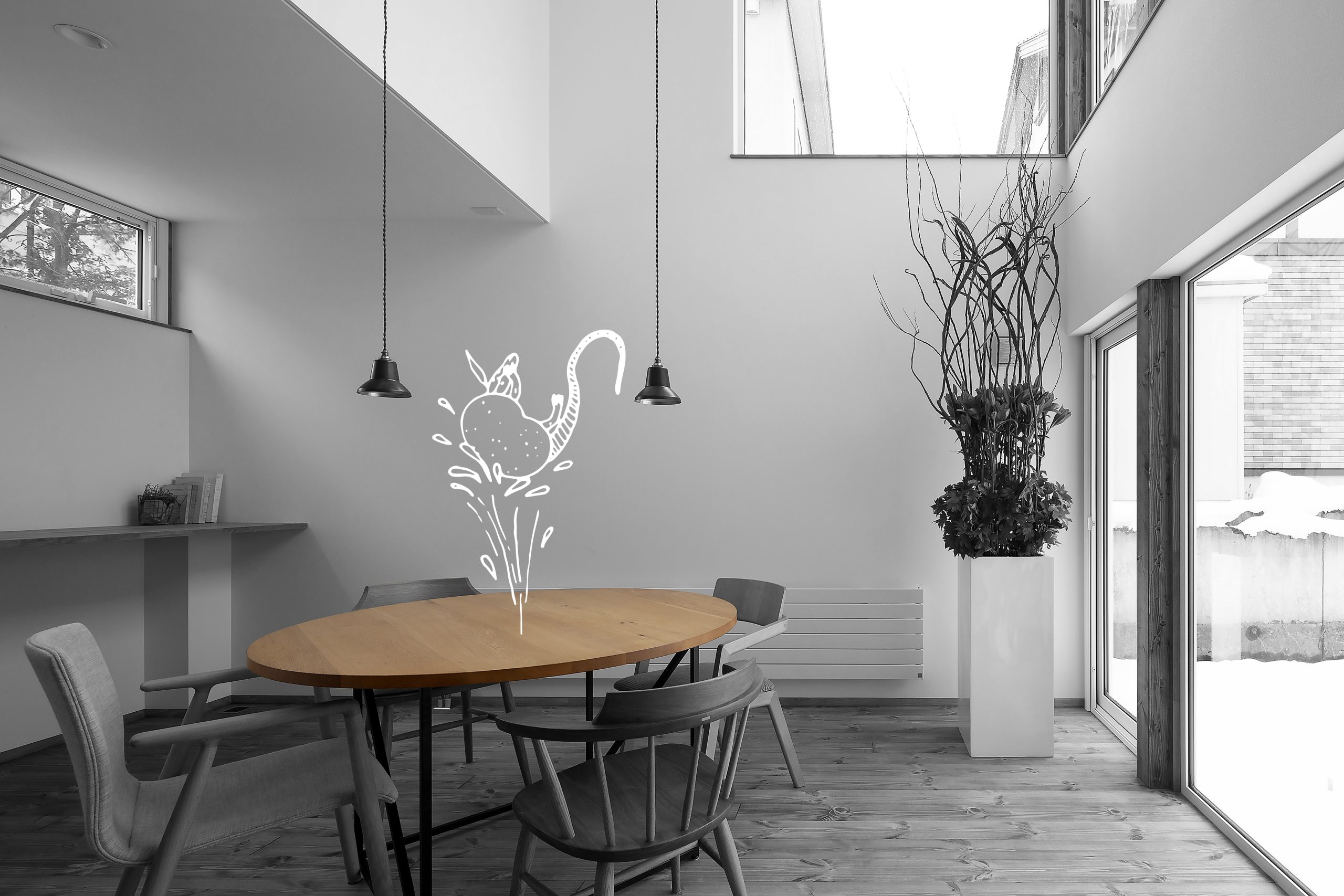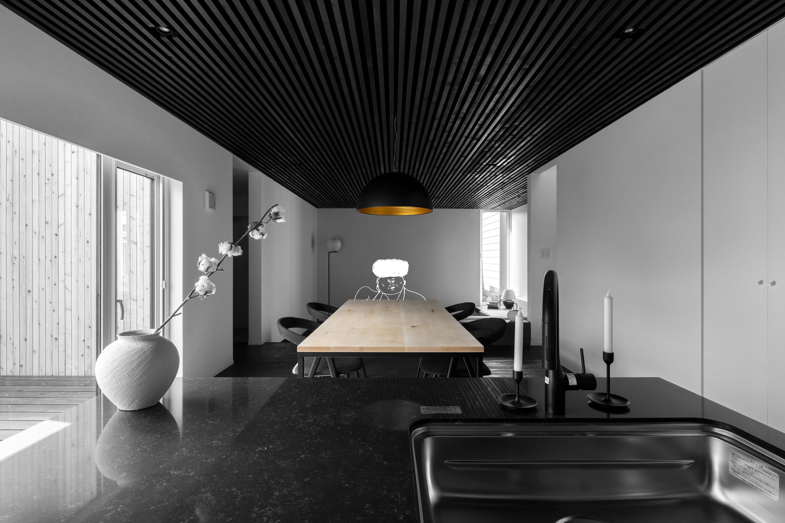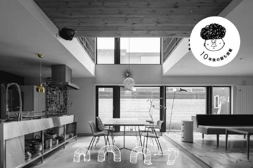 吹き抜けた土間が家の中心に拡がる。 無機質なステンレスのキッチンと鉄骨階段。 境界線のない空間で気の向くままに時を過ごす。 あいまいに使うことで家が楽しくなる。