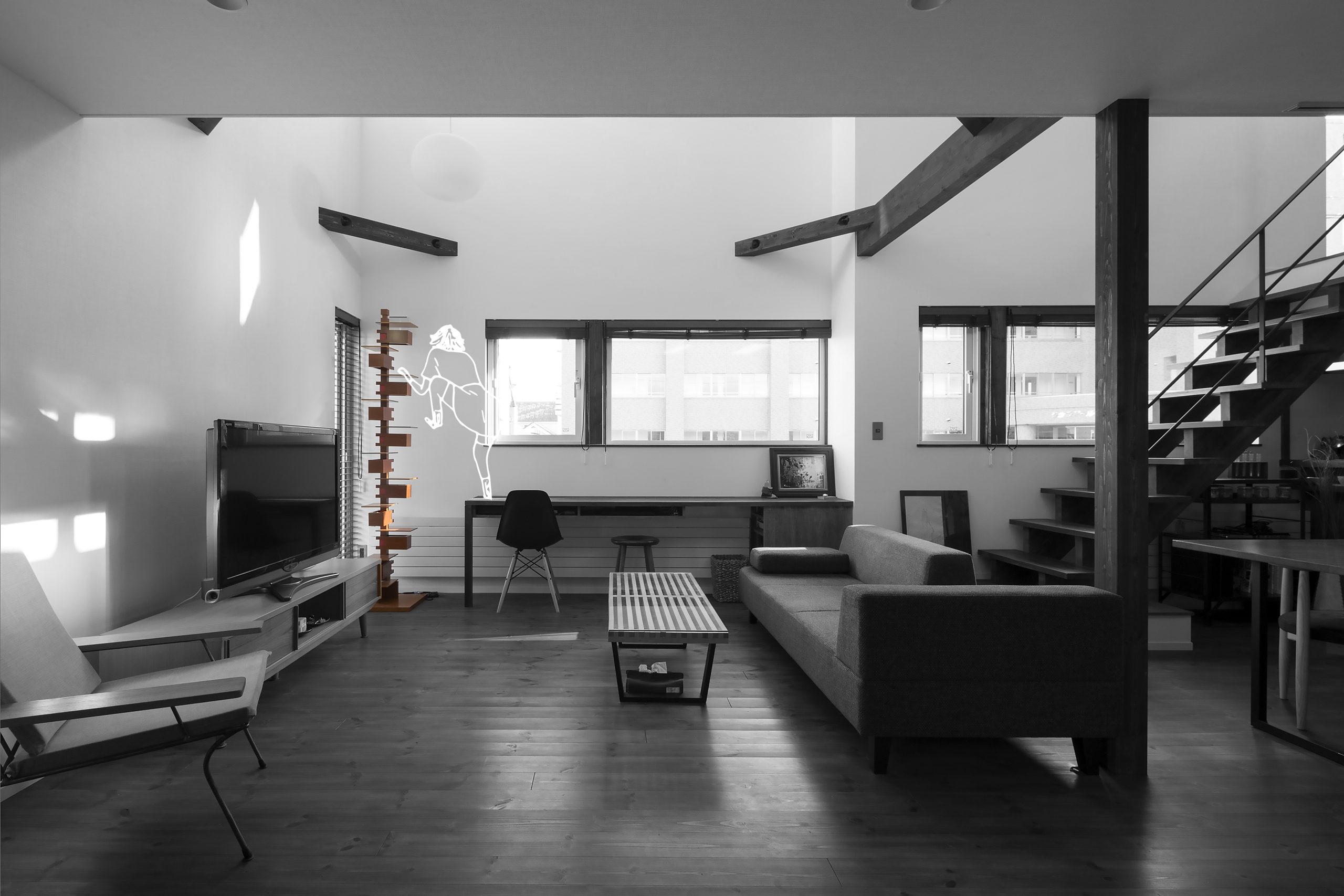 居間の光が籠る おかげで時間も籠る 階段を見上げた先には 樹々の枝葉から漏れる陽の光