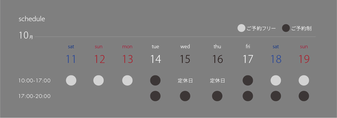 10/11 sat - 26 sun まで ※期間限定Night Open開催 ご予約制 土日予約FREE |