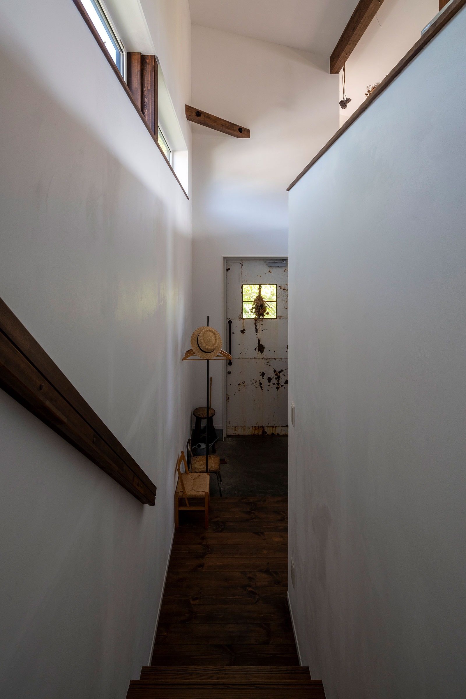 玄関を入ると目の前に広がる吹き抜けの大窓。オーナー様のご希望で伐採を免れた一番手前の白樺は、迫力ある美しい姿を見せてくれます。