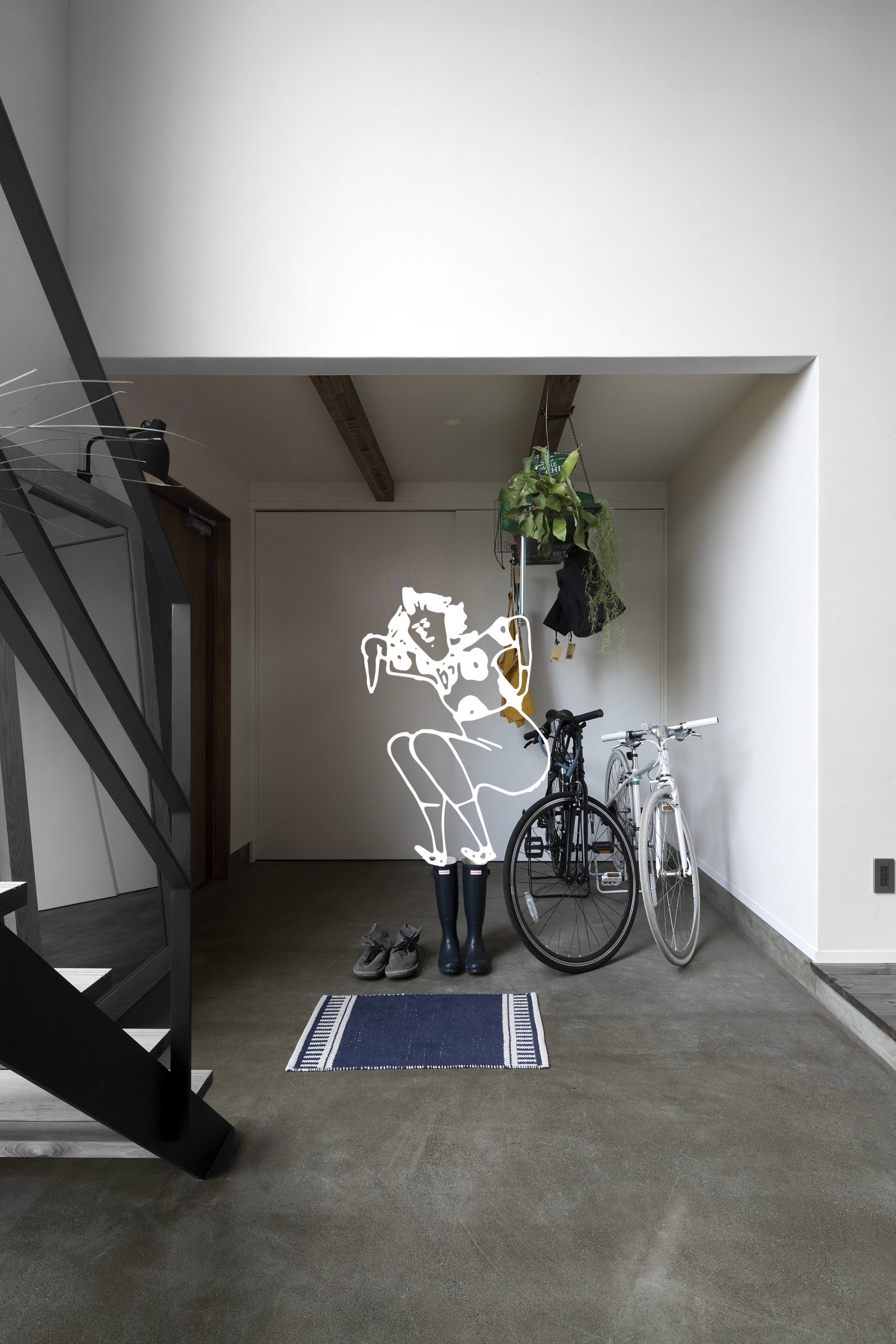 自転車いじりをする土間、植物をたくさんディスプレイできる場所、 多趣味なご夫妻は一緒に大きなキッチンでランチをつくる。 大きな窓、緑の庭、心地よい陽射。 だだっぴろく、武骨に楽しむ。