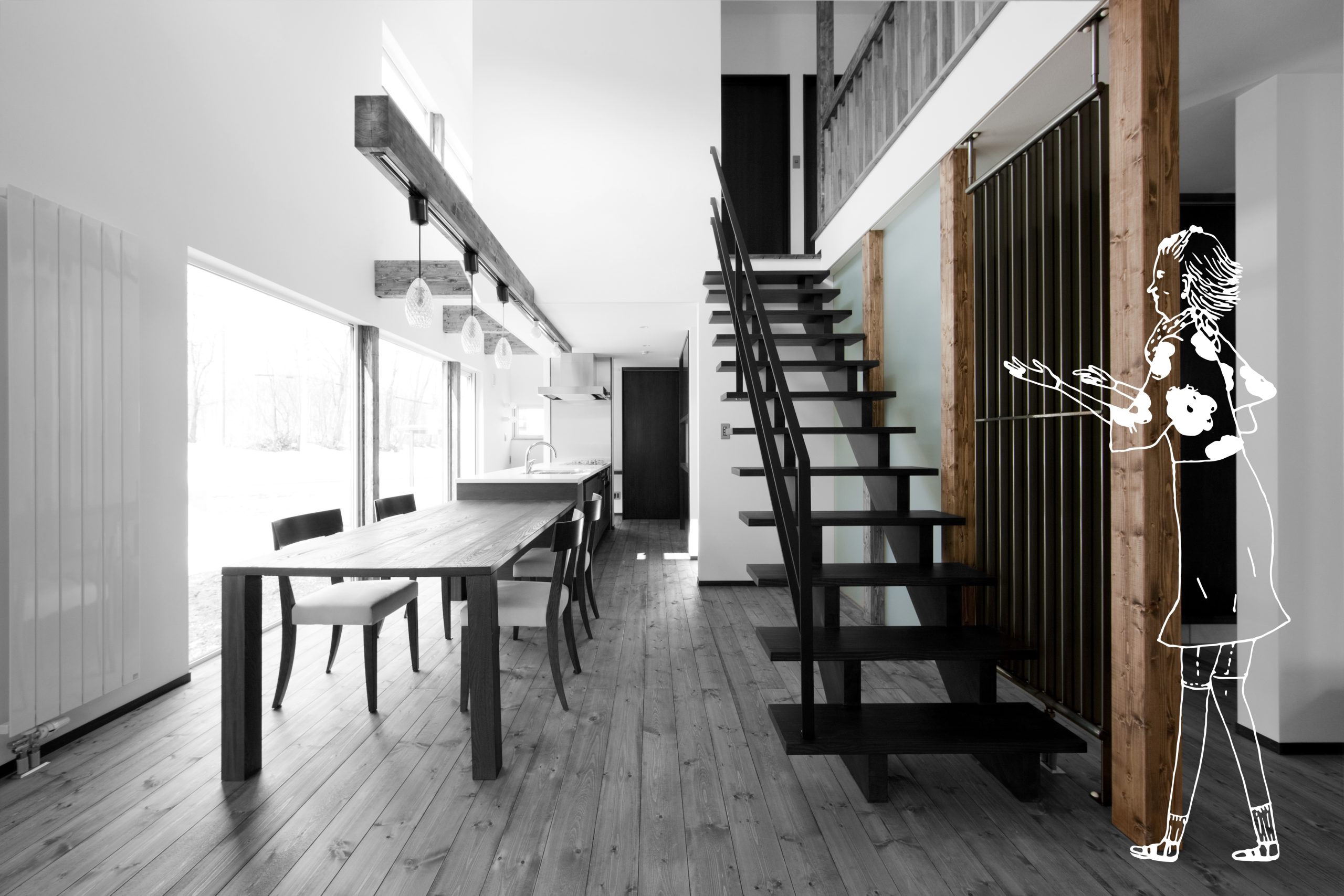 千歳市の住宅街に建つ「ぐるりの家」。 少し前にある防風林から季節の移り変わりを感じ、 大きな窓から1日の太陽の動きを取り込む。
