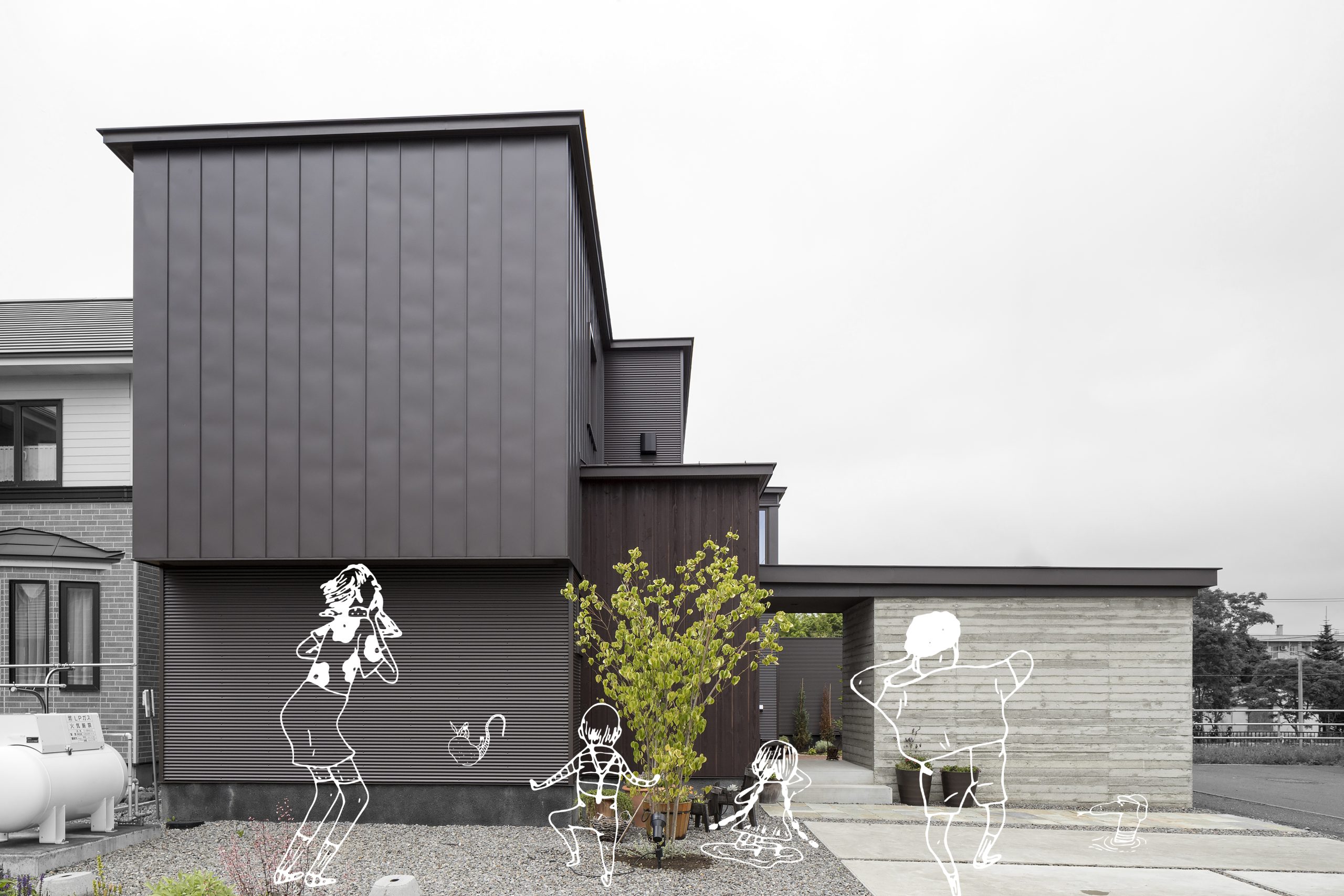 勇払の住宅街に立つコートテラスを備える家。開かれた角地での計画の中で、程よく近隣との距離を保つコートテラスを用いた。このことが外部からの視線を低減させ、常時テラスに向かって開放的な暮らしを実現する。