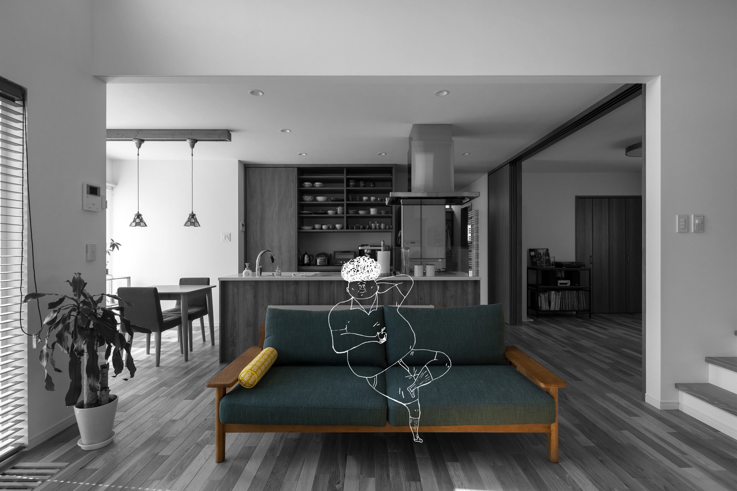 玄関で迎えるのは、 柔らかな日差しに向くひまわりの「藍」。 雑貨や家具をどこに置くか、どこで読書を楽しむか、 家族のこれからの暮らしを場面ごとに想像した。