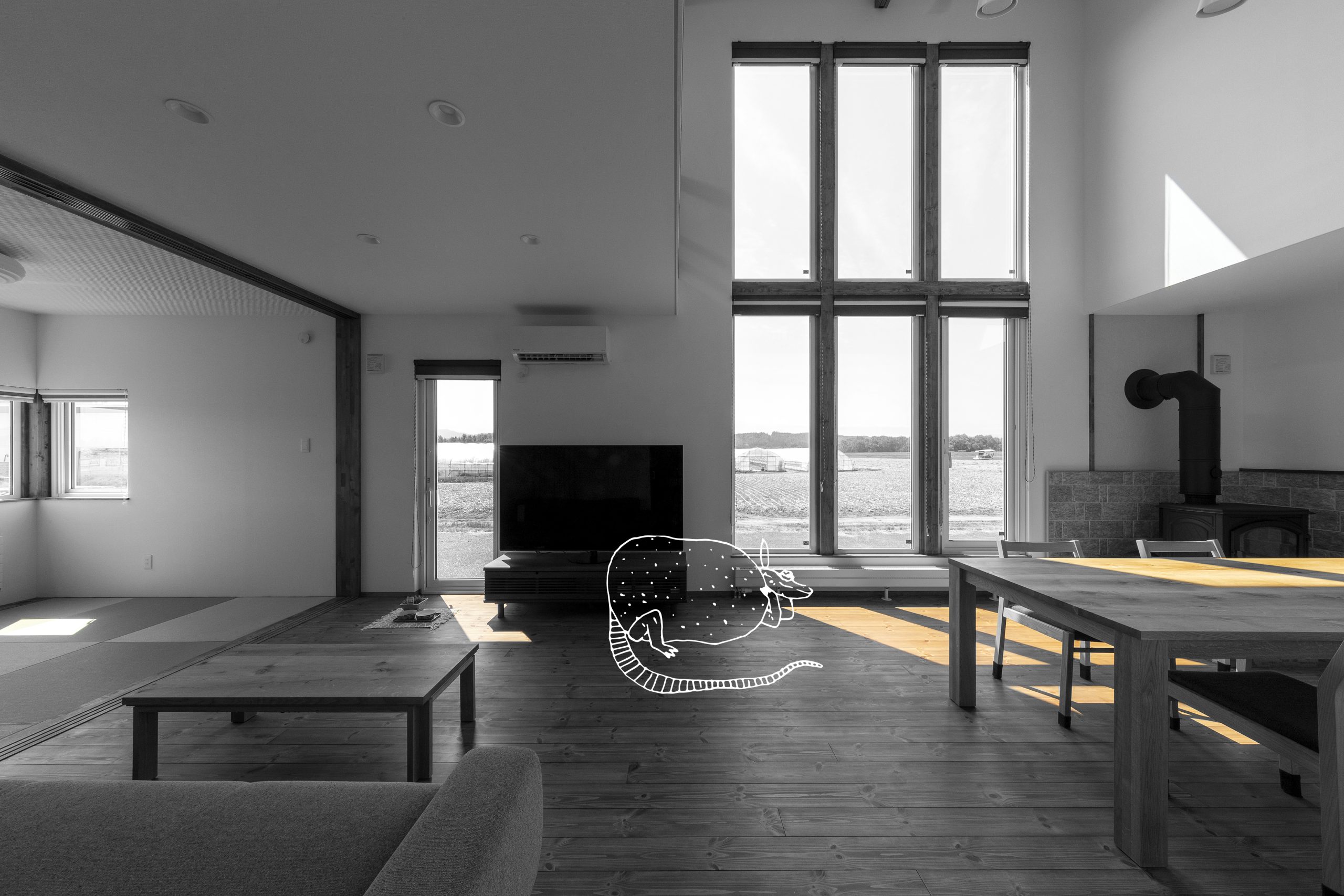 小さな神社のある、山のふもとに暮らす。 ダイニングには、山の四季を取り込む大きな窓。 薪ストーブを囲い家族が集うリビング。 小さな和室からはイグサの香りがする。