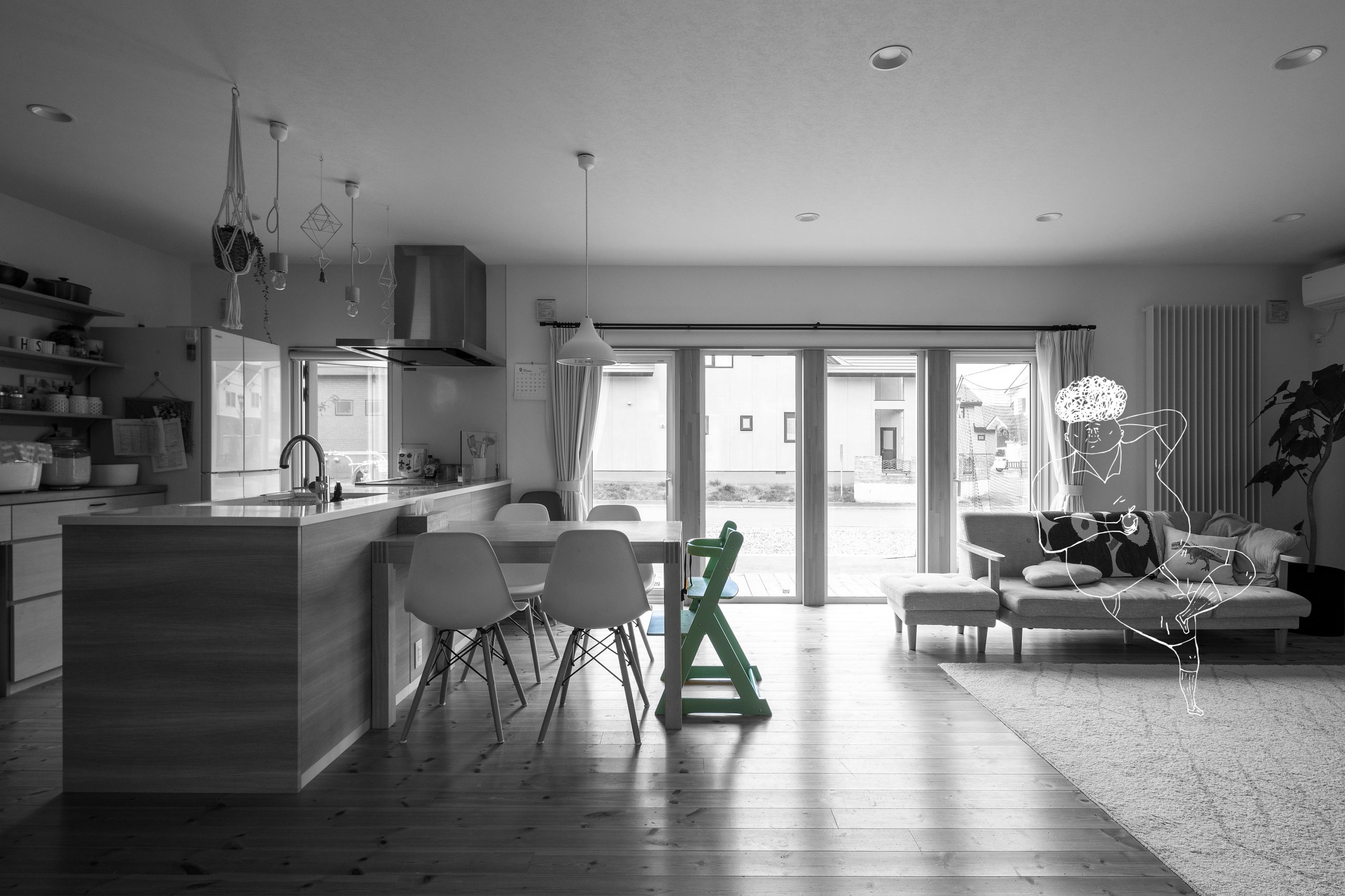ちょっと広めの階段の踊り場で、今日は絵を描こう。明日は本を読もう。 ここに居るとみんなとつながっているから。 リビングもダイニングもキッチンも和室も2階のフリースペースも。 ひとつの空間に、それぞれの場所が点在している。 そして、ゆるやかにつながっていく。