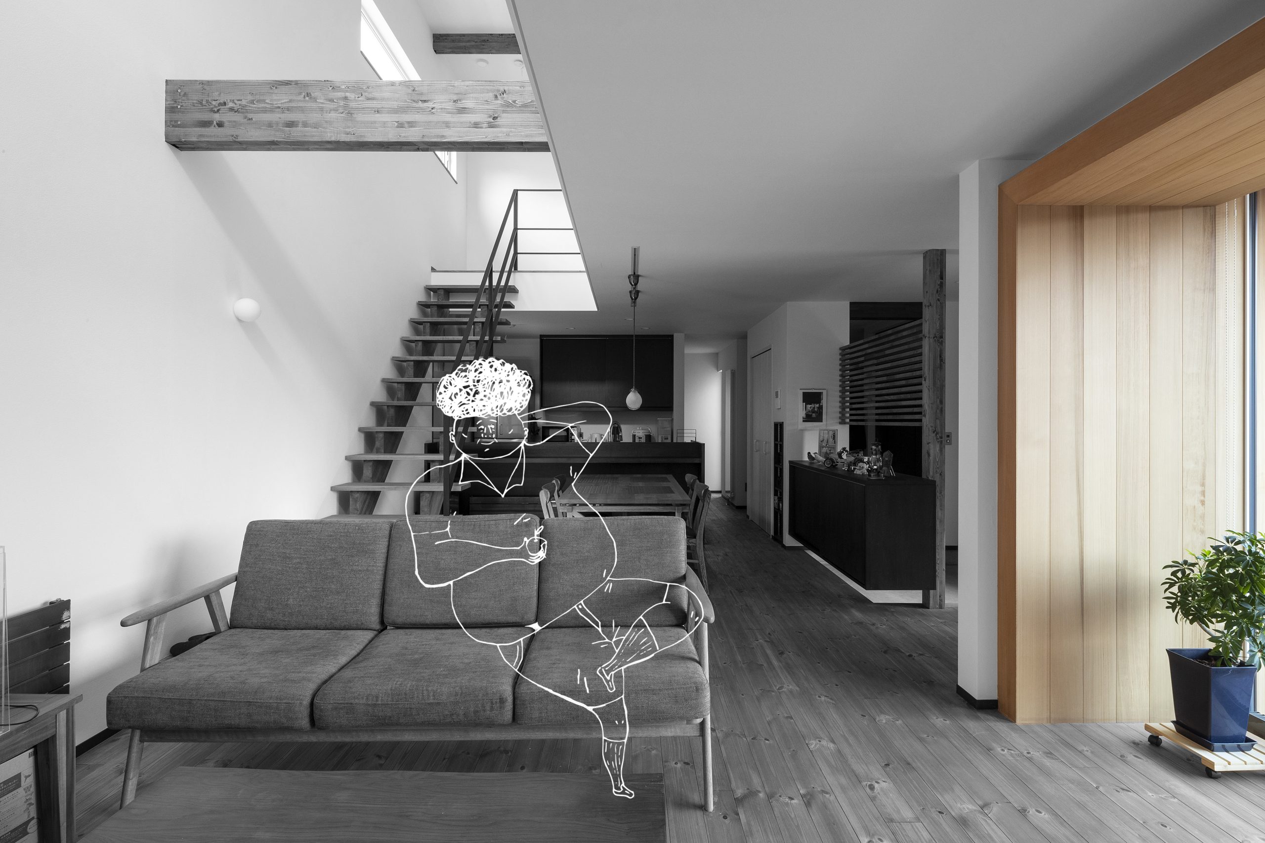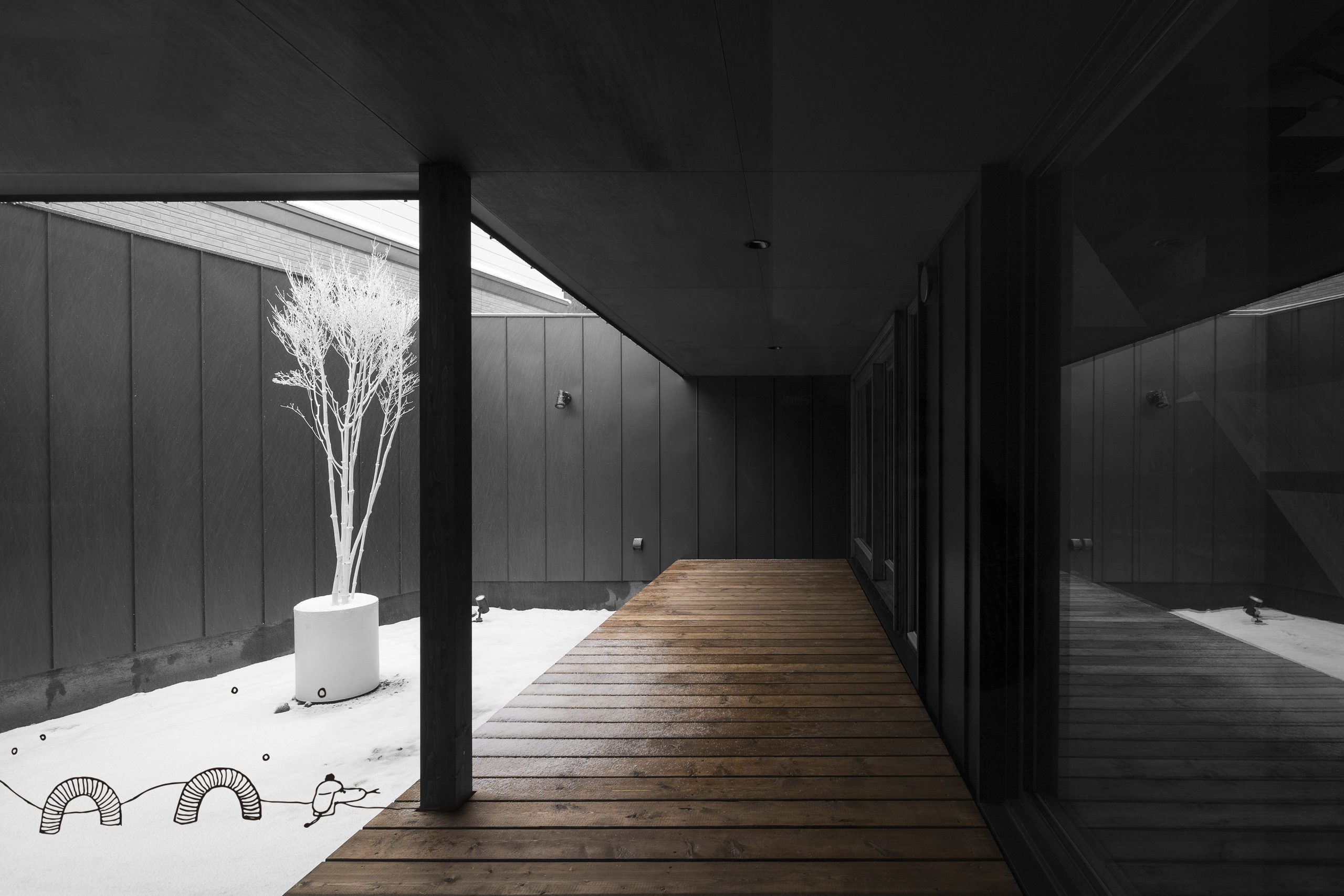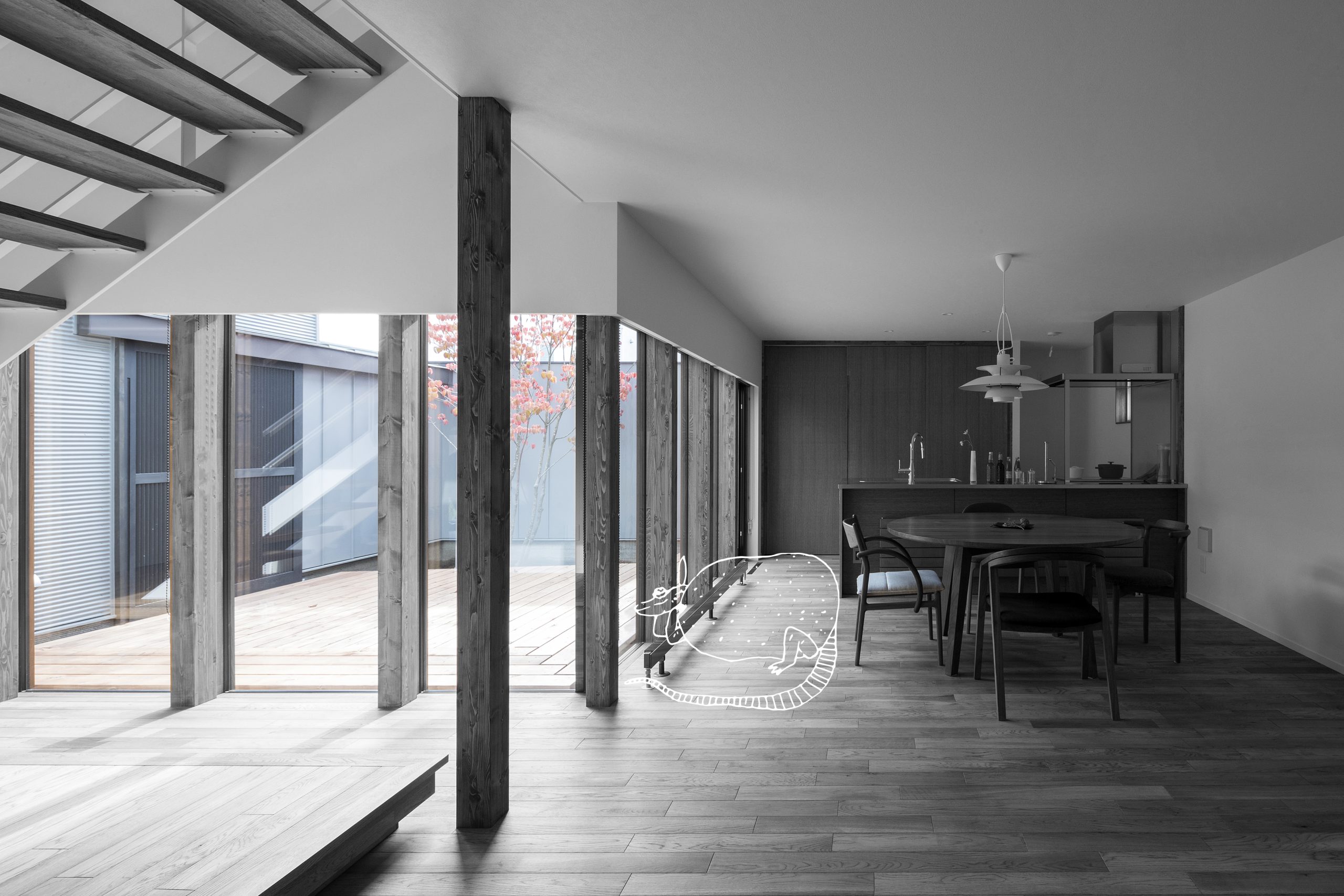 光の強い部分と弱い部分が共存することで、空間にメリハリが生まれる。 居心地の良い場所を、その時々で感じることでアクティビティが生まれる。 その時間、その季節で感じる余韻。