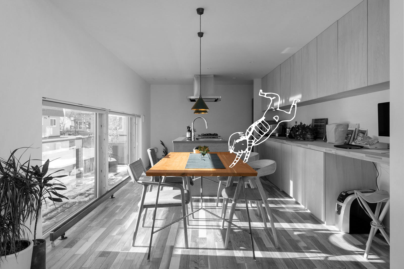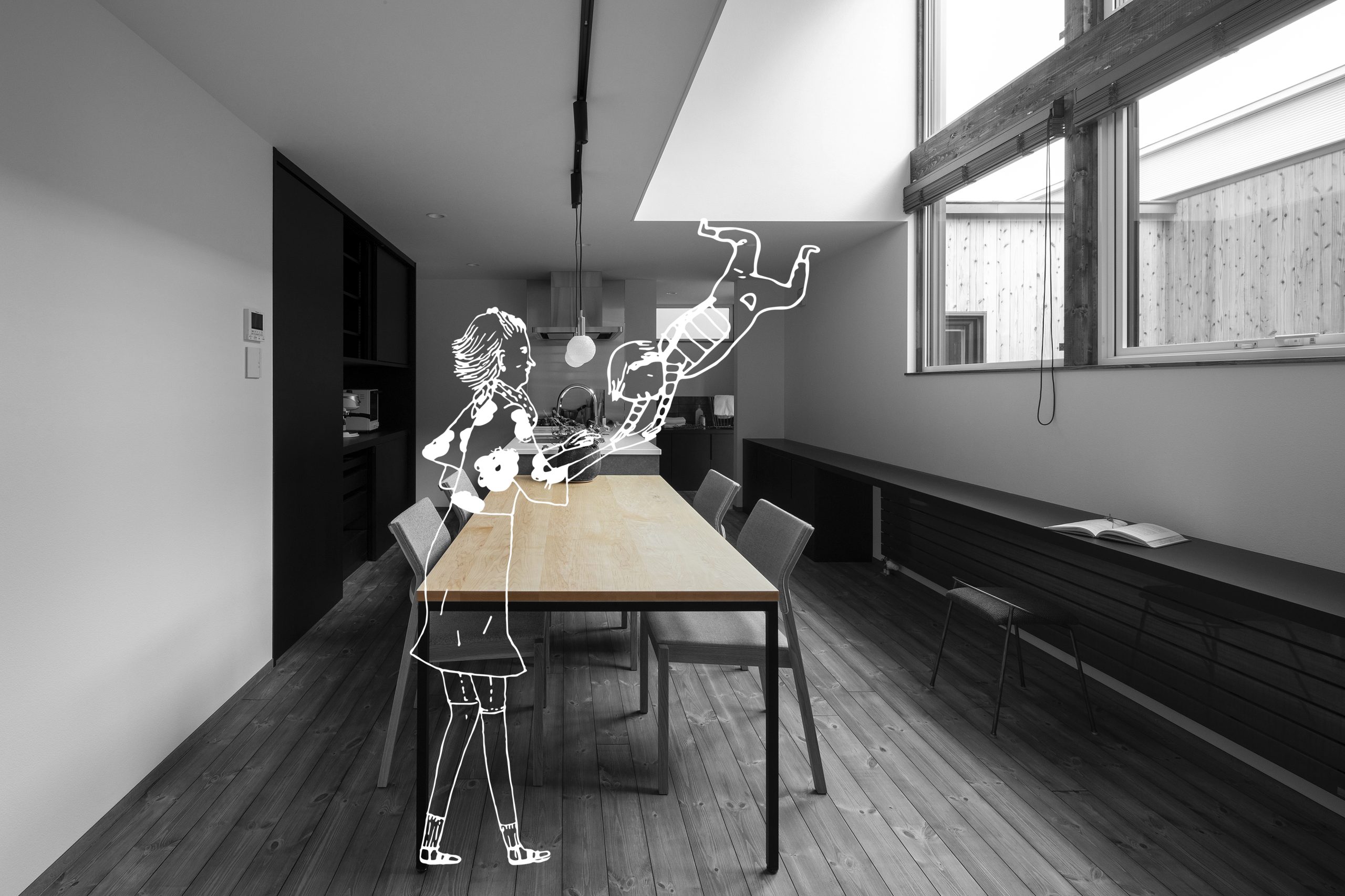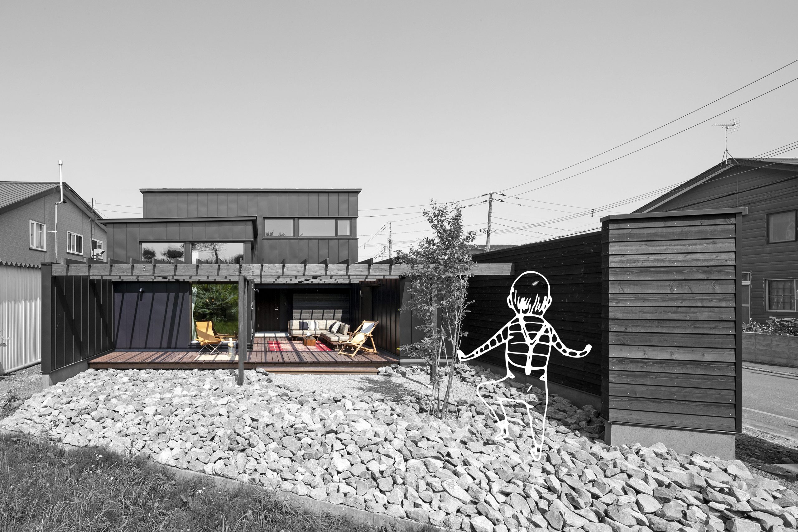 室内が屋外に滲み出るように拡がり 有りの儘の空の下に居る心地良さを感じる。 いつもの食事を外の間で いつもの団欒を外の間で、 多様なアクティビティーが生まれる外の間。