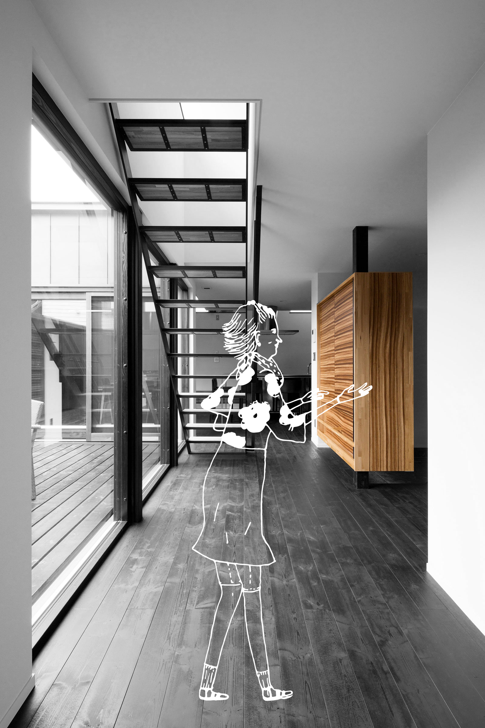 南側道路に面した住宅地に建つ。 視線を遮るもののない、開けた北側のロケーションを、 リビングのソファに座りながらも、自然と感じられる窓の配置とした。 その反対側にある吹抜けの窓から、たくさんの光を取り込む。