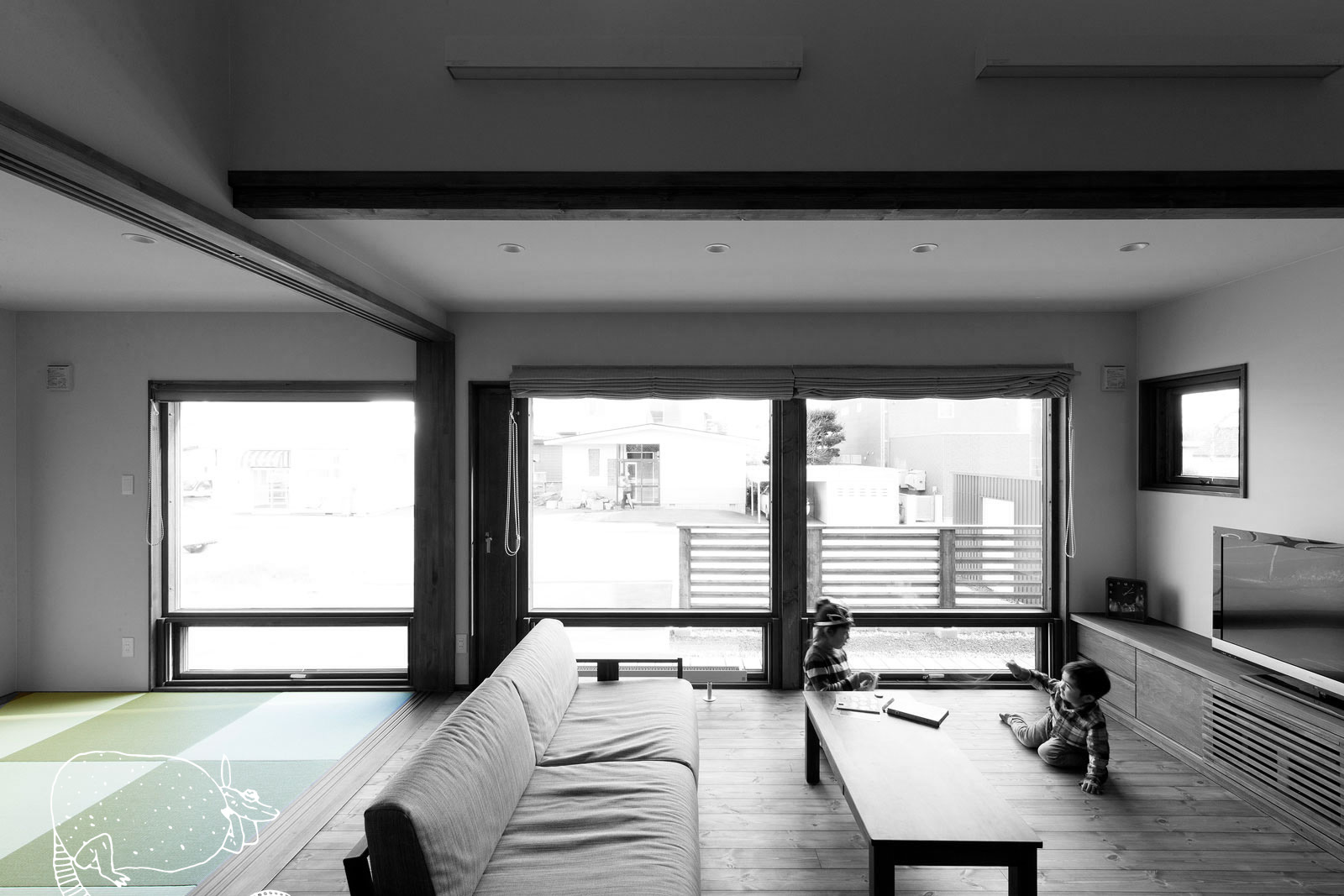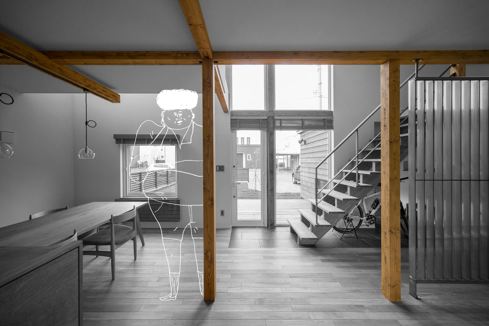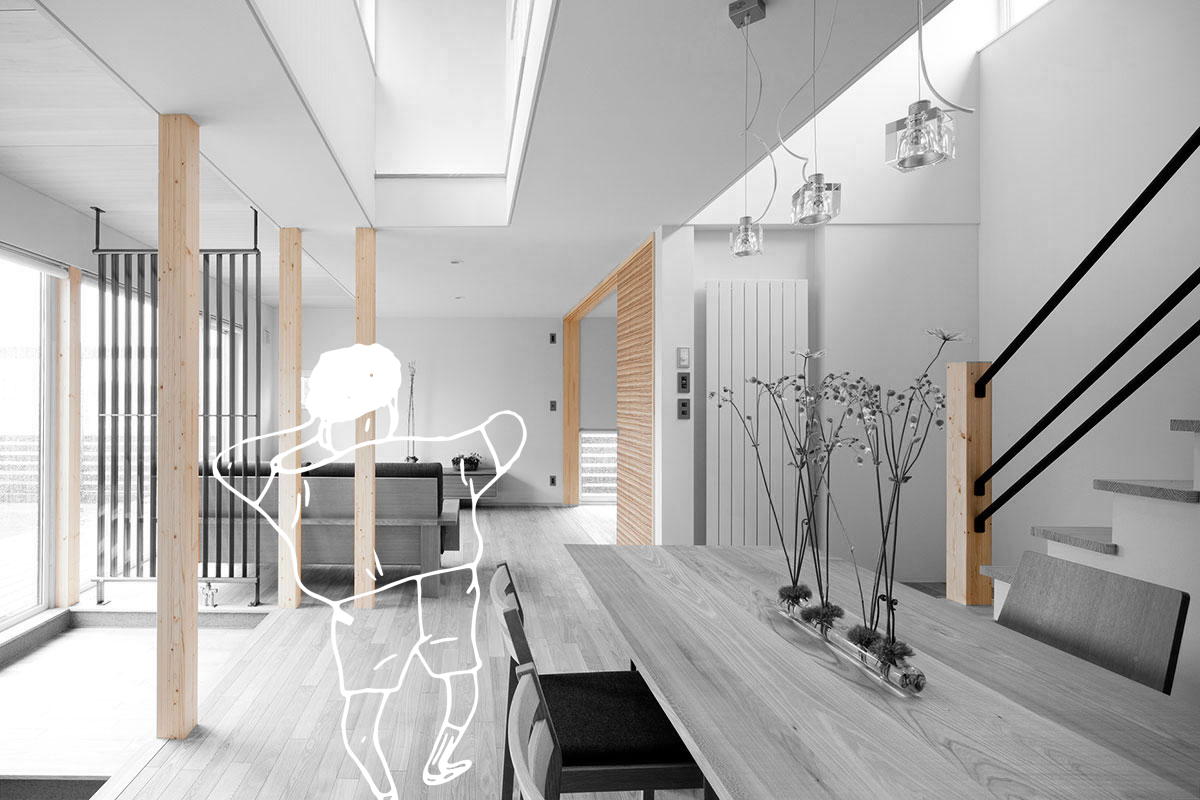 南側道路に面した住宅地に建つ。 視線を遮るもののない、開けた北側のロケーションを、 リビングのソファに座りながらも、自然と感じられる窓の配置とした。 その反対側にある吹抜けの窓から、たくさんの光を取り込む。