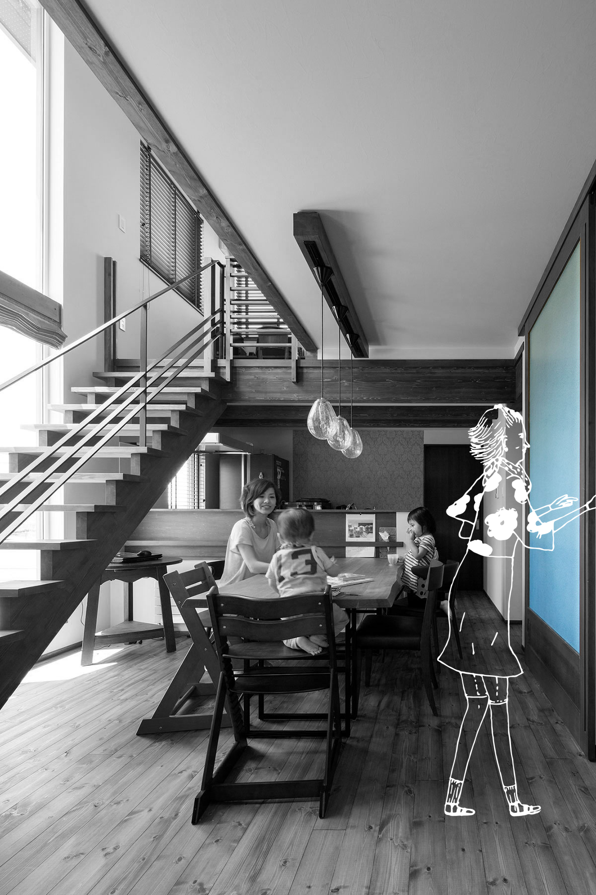 北面は木の陰に隠れ、南面には大きな窓を全面に、 リビングを吹き抜ける開放感と大きな窓から差し込む日差し。 窓には木製窓を使用し、圧倒的な存在感がある中にも気密性にも配慮を。 家全体から木を感じられる家。