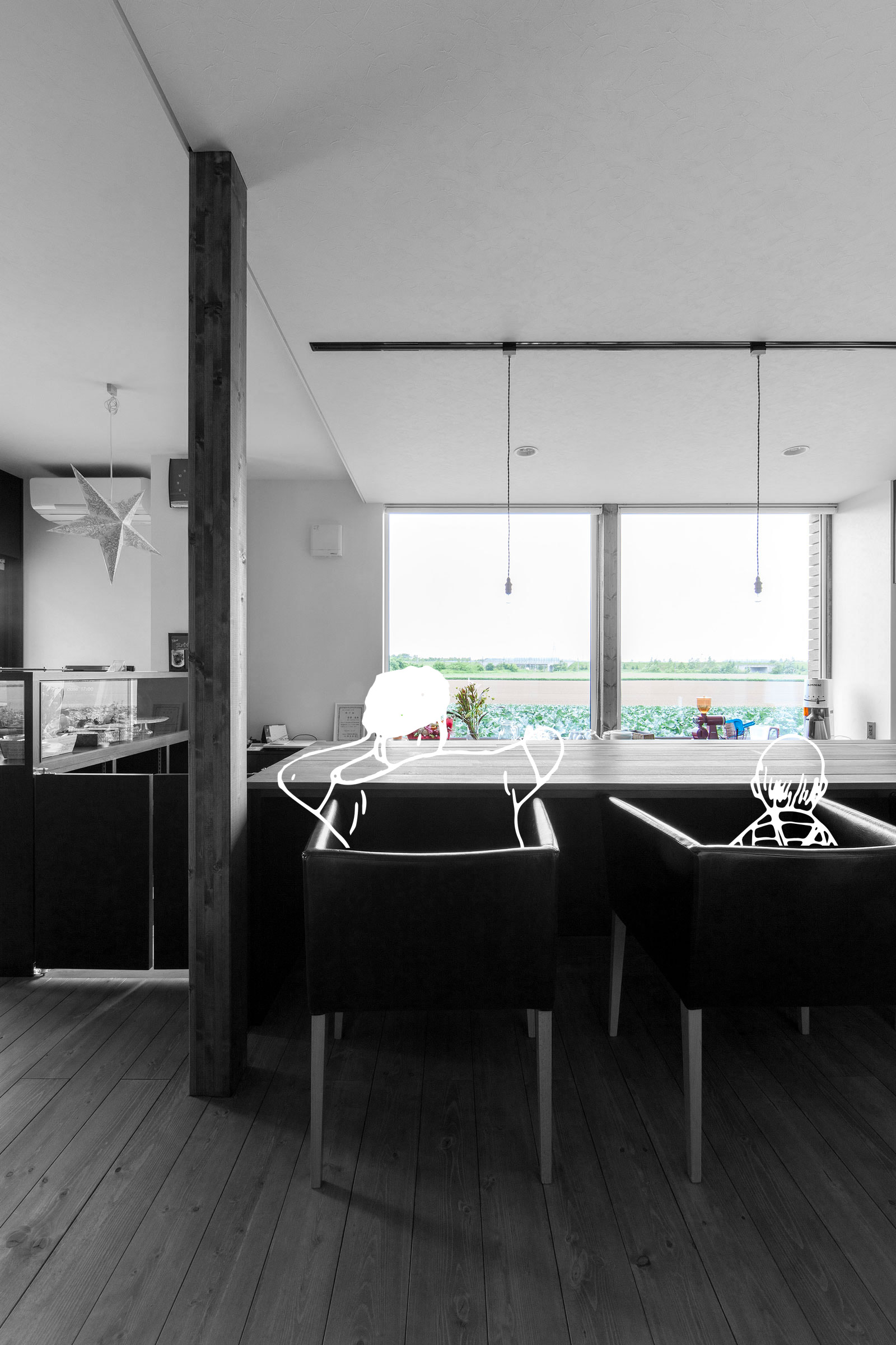 ロケーションを活かした住宅街のカフェ併用住宅。 リビングのソファに座りながらも、自然に入り込む緑。 限りなくワイドを強調したプランニング。 立ち上がりの無いフラットカウンターから広がるロケーション。 優しさの感じられるしつらえ。 外観は白模型に浮き上がるような、木のアクセント。