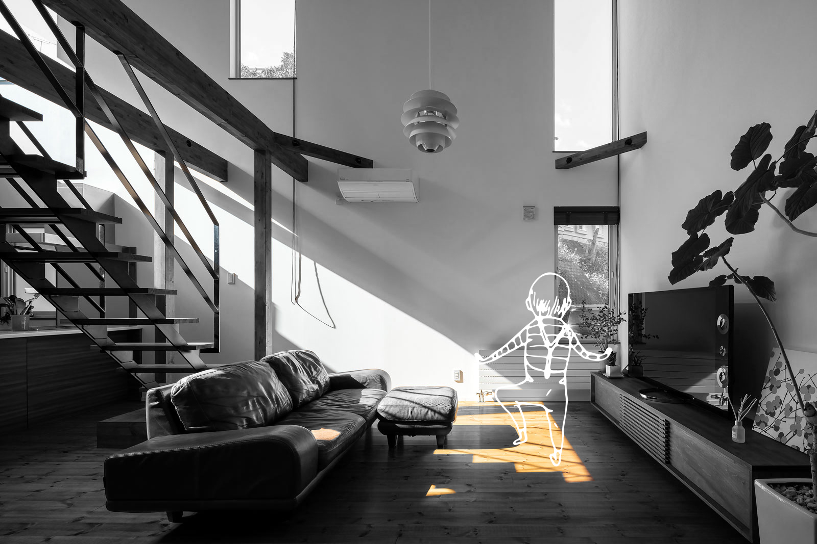 一段高い和室に腰を掛けると、ソファに座っている人とL字形の関係性が生まれる。 和室に腰掛けると目線は自然と吹抜けを見上げる。 星影と月影に満たされたリビング。
